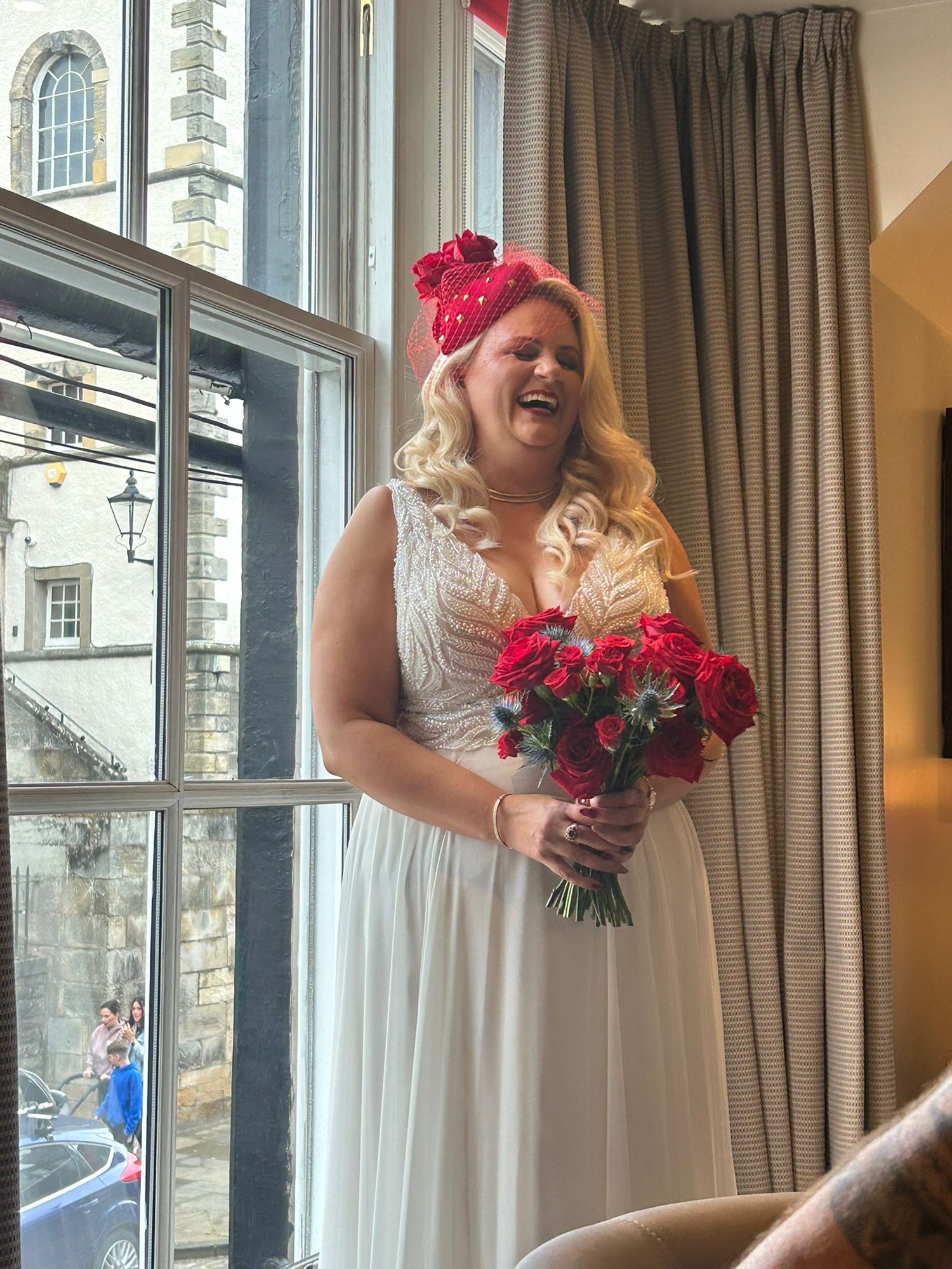 I loved working with Lisa at Off With Her Head Millinery to bring to life my idea of a red hat for my wedding. She was really helpful with ideas and little touches such as making the base a heart shape and including gold studs which I love. Very excited that unlike a veil I can wear it again.